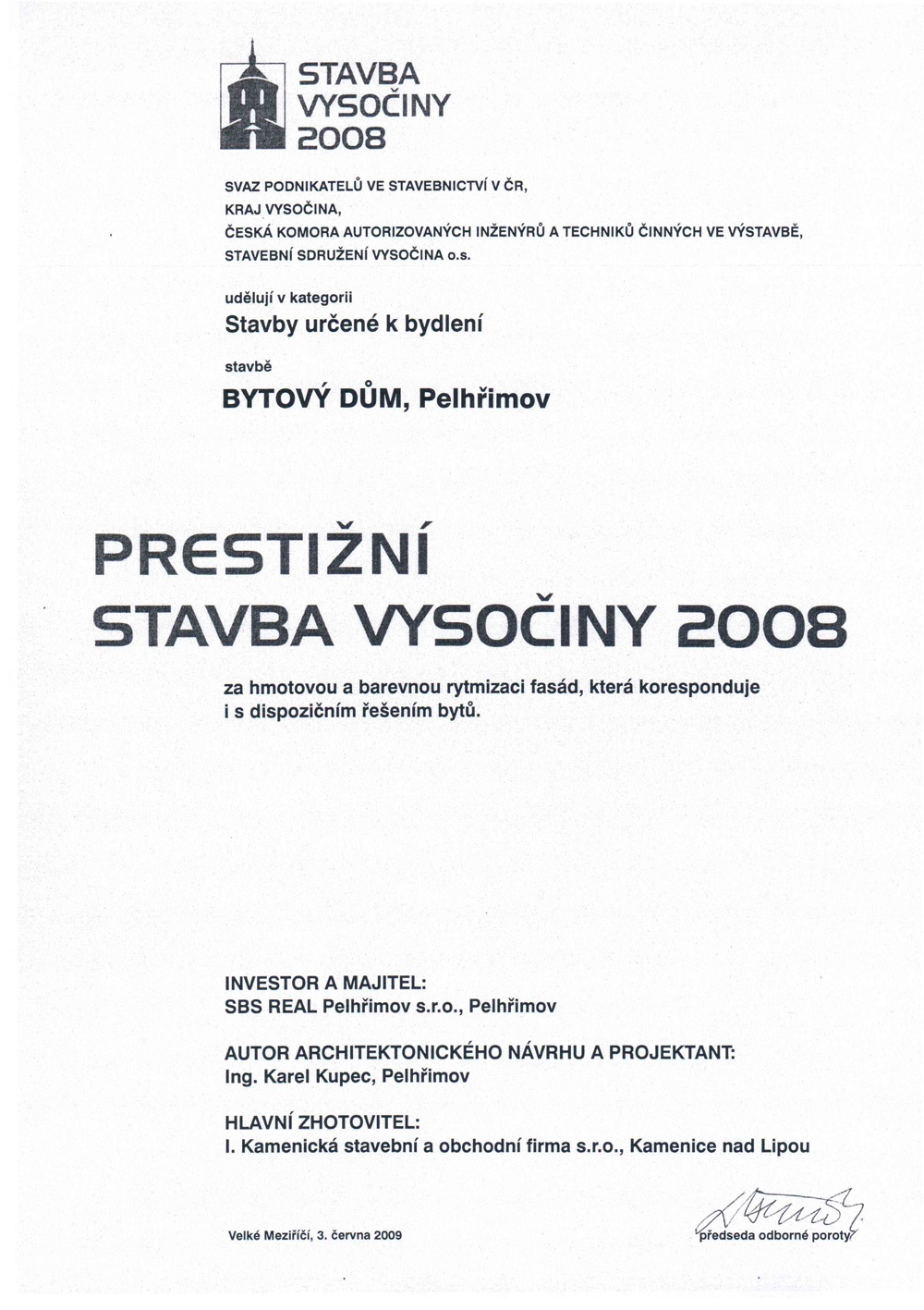 V roce 2008 a 2010 jsme zrealizovali v Pelhřimově ve Sdružené ulici výstavbu dvou bytových domů s 32 byty včetně garáží a parkovacích míst. Jednomu z domů byla v roce 2008 udělena cena PRESTIŽNÍ STAVBA VYSOČINY v kategorii určené pro bydlení.
